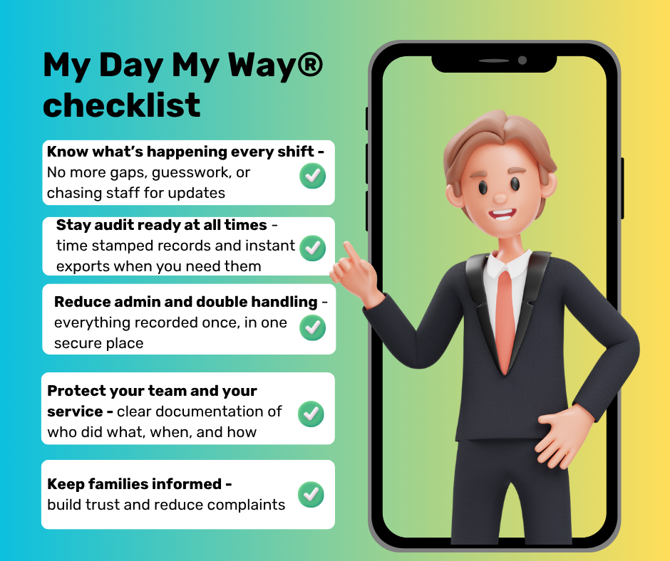 Whether you’re a family member wanting clarity or a provider needing transparency and protection, My Day My Way helps you see what’s happening — as it happens.